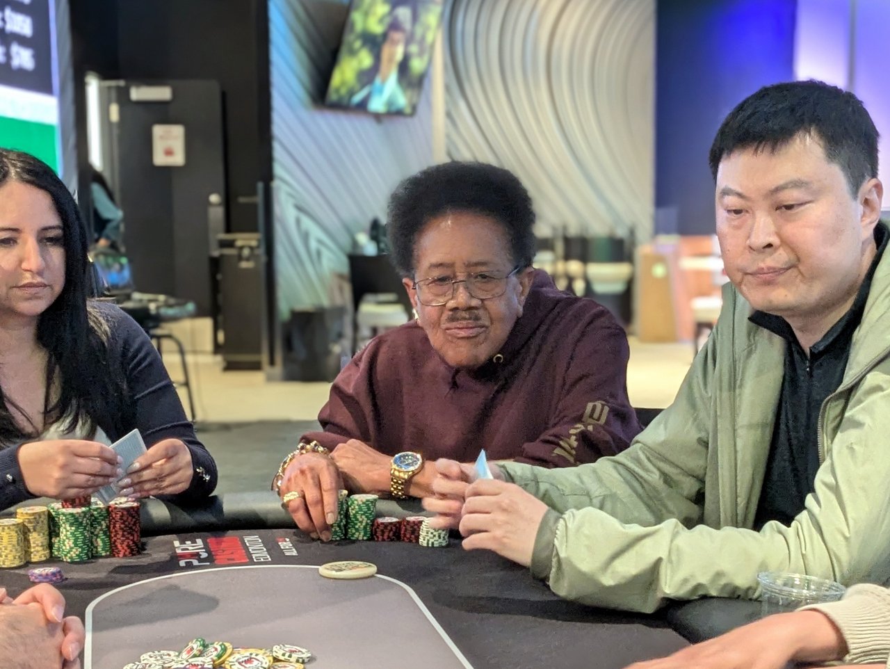 In one example of the latter, Li was stuck in the middle of Fong and Teliani. In what turned into a massive pot, Teliani bet the 8♠7♦3♠ flop and Li called before Fong potted it and Teliani called for less. That left Li facing a decision — Fong outchipped him at the time, and after a couple of minutes of going over the hand action, he found a fold in the huge pot. I don’t know what he folded, but regardless, it was an example of strategic play that ensured he kept playing with a stack. Teliani eventually ran out to a bigger boat than Fong to stay alive with a double plus.