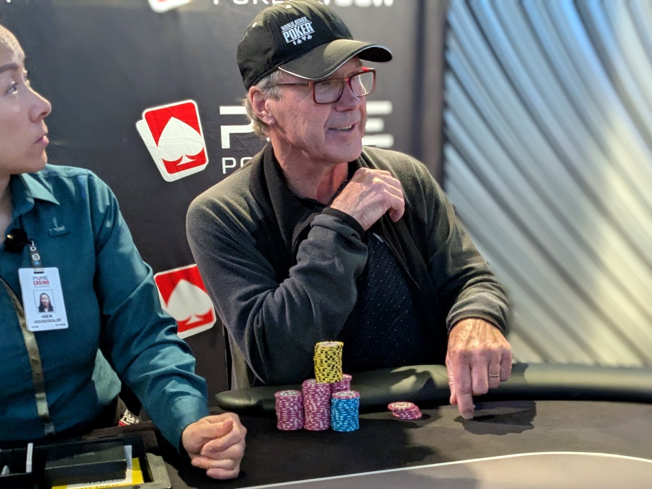 Pat Wilson DJ Sharma is running over the table now, as he’s just set Pat Wilson to the cage for 4th-place money. Sharma shoved sevens and Wilson called with ace-king. The board bricked for Wilson and the sevens held. Sharma usually says he loves any hand with a six in it, but tonight he may just be on the sevens instead.