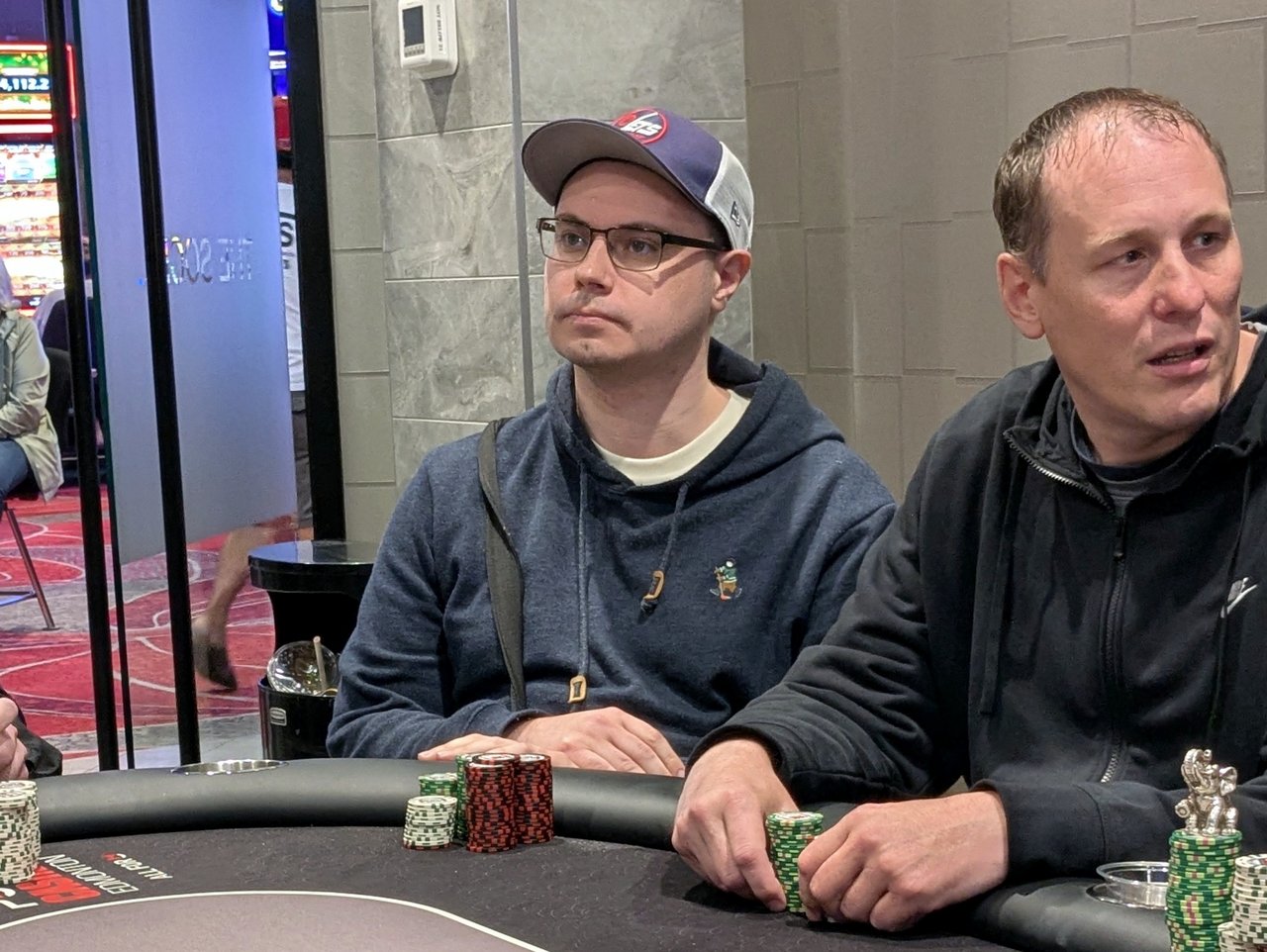 Dallas Larson limped in with pocket jacks, then jammed when Jimmy Lee made it 420k to go. Larson was clearly trying to trap, but instead ran into pocket kings for Lee. Lee snapped off the jam with more, and the nine-high double-paired board didn’t change anything, leaving the kings in front and Larson heading to the cage for second place.