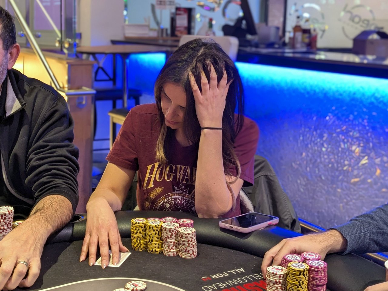 Level: 10 (1000/1500/1500) Entries: 48/80 Prizes: $20,520 The prizes are now over $20k with 80 entries on the board. Level 8 has a bit more than 5 minutes to play, which puts the end of entries a bit more than 30 minutes away. Maddie Sharma has recently entered the game, taking up her husband DJ’s first seat of the night, which he vacated for a rebuy shortly before Maddie bought in.