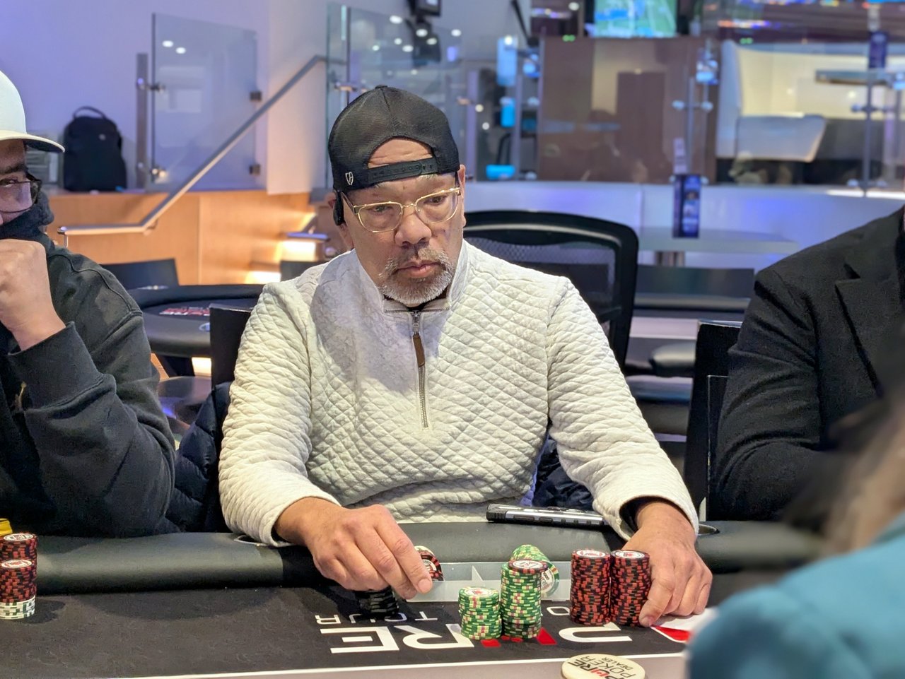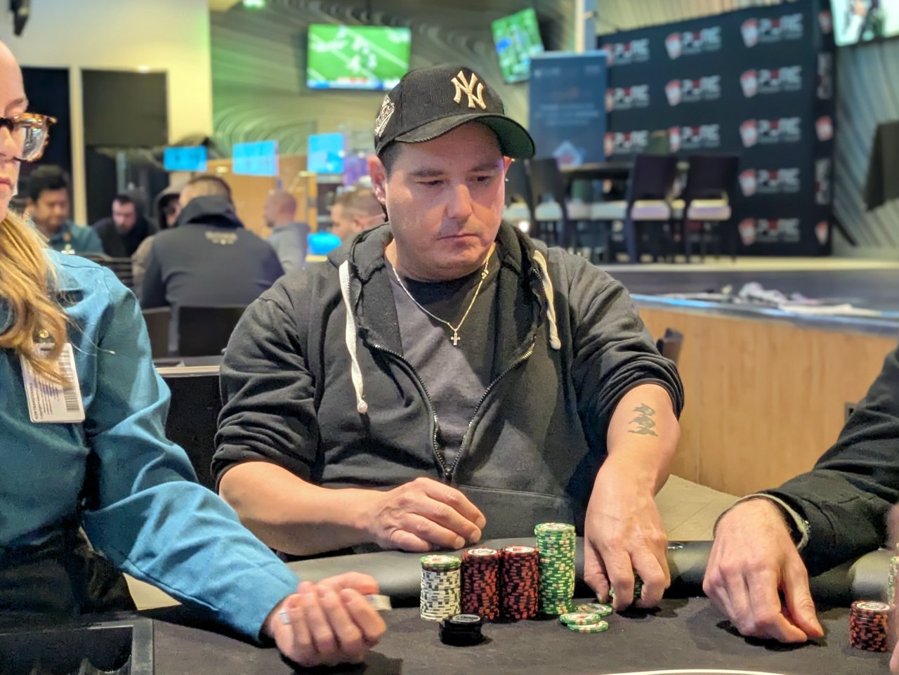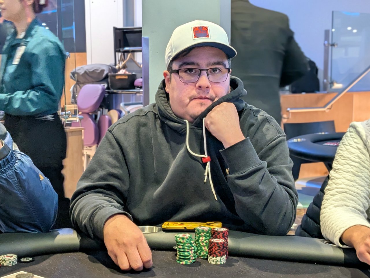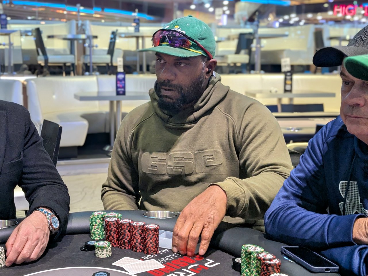 Michael St. Pierre-Porter There are five players left in the Bounty side game now, after Jim Giddings and Michael St. Pierre-Porter hit the rail recently. I missed the action while I was sorting out the end-of-day work for the PLO Main Event.
