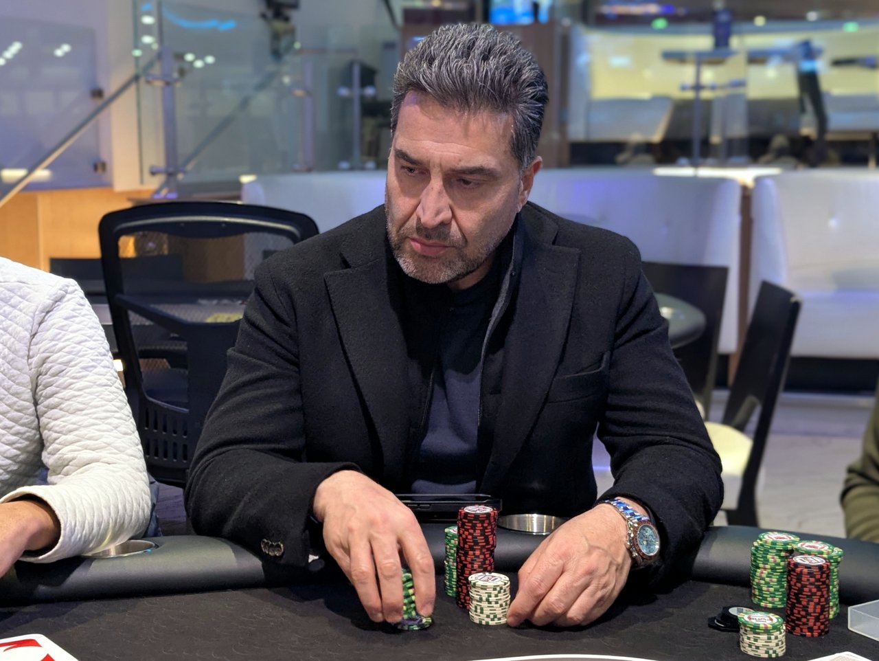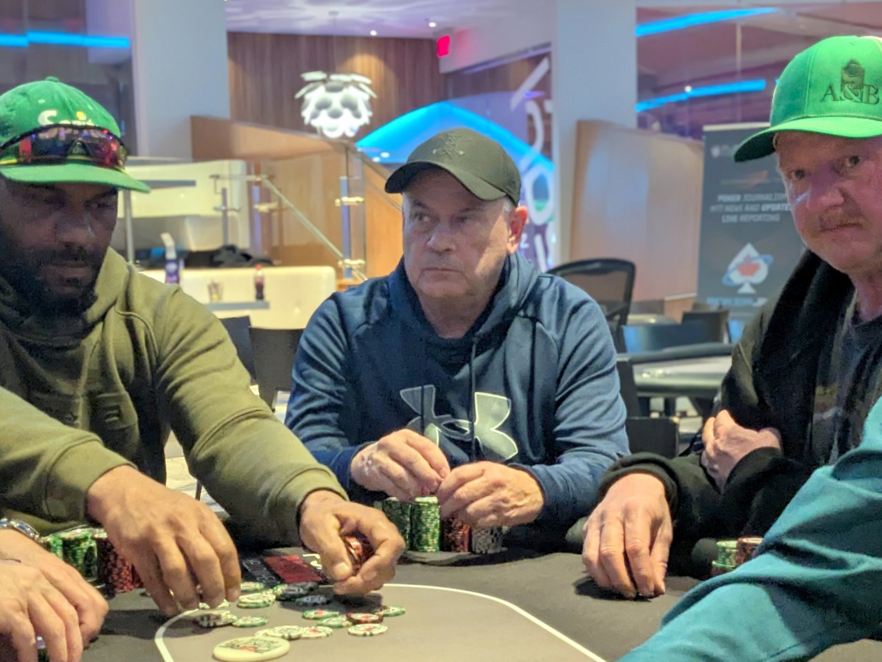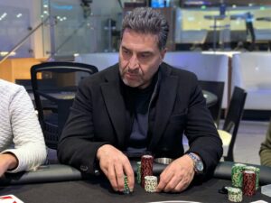 Azizi was best with ace-queen for second pair, but Froelich was drawing to clubs with 6♣3♣. 5♥3♠ bricked his clubs and he was out in 3rd for the agreed-upon $3,500, and he was pretty happy to grab his first cash.