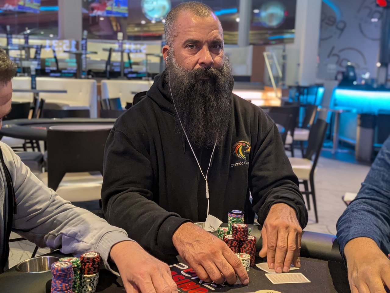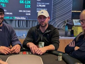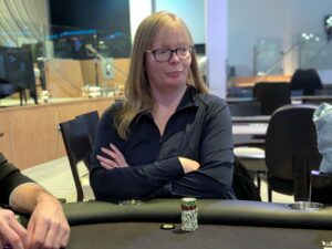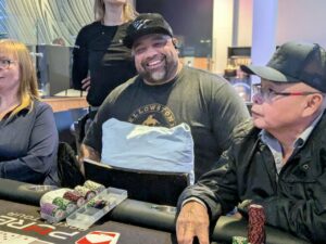 Early in the FT she lost some chips to Tom T, then found herself chipped down, and all in at risk against Ryane Sanders. She found a straight to get a huge double up back to the top of the counts, while leaving Sanders the shortest of the three remaining players. He managed to spin a bit back with a double through runner-up Kenneth Budd, but he wasn’t able to make it last, ending in 3rd place.
