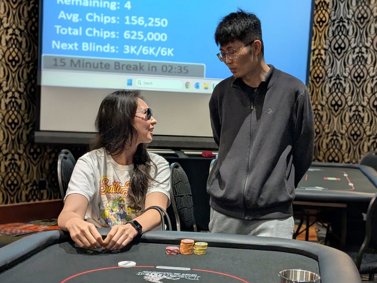 Level: 17 (4000/8000/8000) Entries: 3/25 Prizes: $7,125 The Team game is now in the money with three teams left. Kang Lee & Shayla Mah were the bubble tonight, and Kelly Gall & Maru Somers are playing the big stack with around 300k, or about half the chips in play.