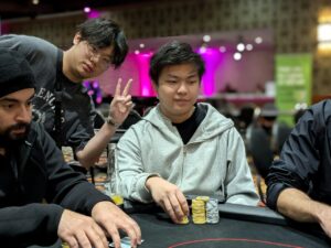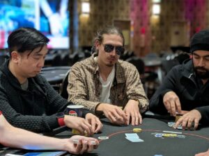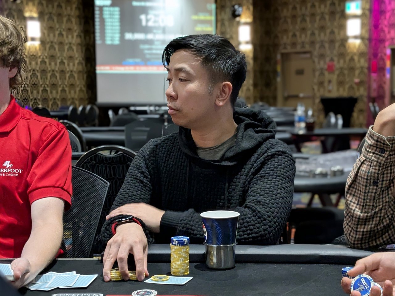 Kevin Huang Kevin Huang was short after doubling up Griffin Ristevski in the previous hand, and he shoved, but ran into pocket aces fro Craig Caldwell. He couldn’t find his cards and ended in 6th place tonight. He’s off to get some sleep for Day 2 of Event #4 tomorrow, where he’ll be in with his friend and rail Kezheng Peng.