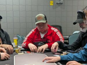They can enter or rebuy for the first 8 levels of play, with the entry desk shutting down after the dinner break following Level 8. That should put the last chance to enter at about 6:45 PM. After that, they’ll play down to a winner before they end.