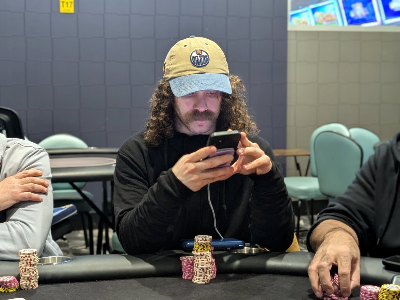 Dalphond called before Benny Sarnelli shoved. Thomas Taylor came in with a shorter stack, and it was three-ways all in, with Sarnelli looking to bust two. Sarnelli was on ace-eight against queen-jack for Taylor and king-ten for Lefe. Sarnelli turned an 8 to take a bigger lead, and held to send both players to the cage.