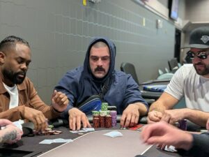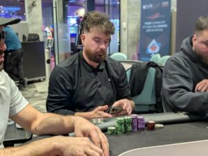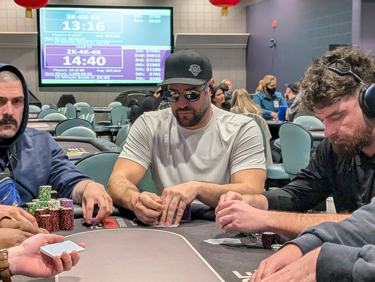 Cards go in the air at 1 PM, with blinds lasting 30 minutes. There are 8 levels of open entry to buy or rebuy a 30k stack, with the desk set to shut down at 5:45 PM after the dinner break following Level 8. From there, they’ll play down to a winner.
