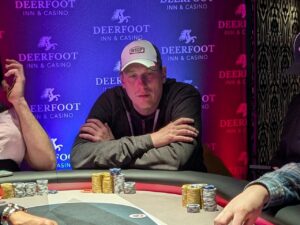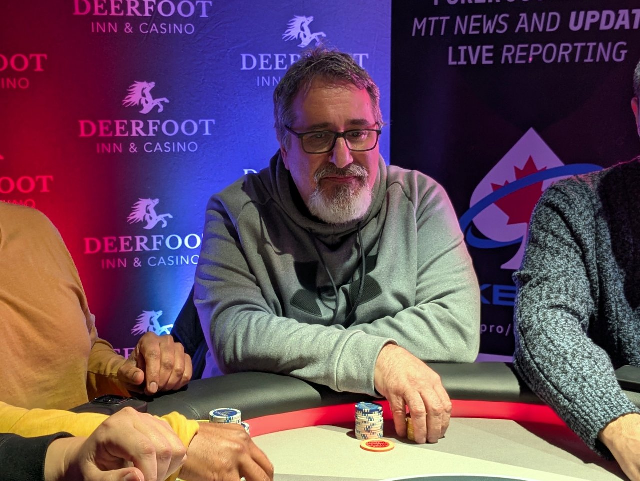 Steinbach was ahead, but Bruneau found an ace on the river for two pair to send all three other players home. Meanwhile, two players busted from the other table, to bring the game to 13.