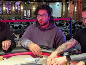 Level: 28 (60000/120000/120000) Entries: 3/413 Prizes: $212,695 Local Time: 4:20 AM Tyson Malo shoved the small blind, saying, “Time to die” with a smile. Andrew Sabbagh called from the big blind, and it was a fair fight between ace-six of spades for Malo and king-queen off for Sabbagh. The board of 8♥7♦3♥J♠7♠ missed both hands, and the ace-high took it down for a double.