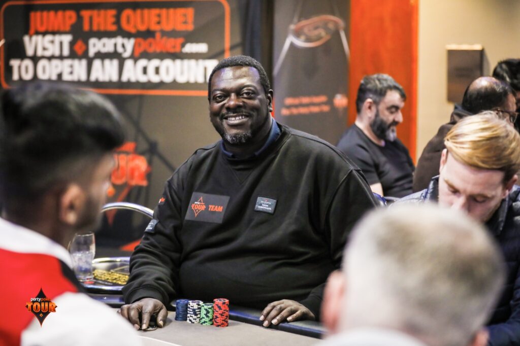 After a preflop raising war, Charles Smith was all-in for around 30,000 and at risk against PartyPoker Ambassador Sam Acheampong. Before the cards were tabled, Smith said to Acheampong “You’ve got me”.