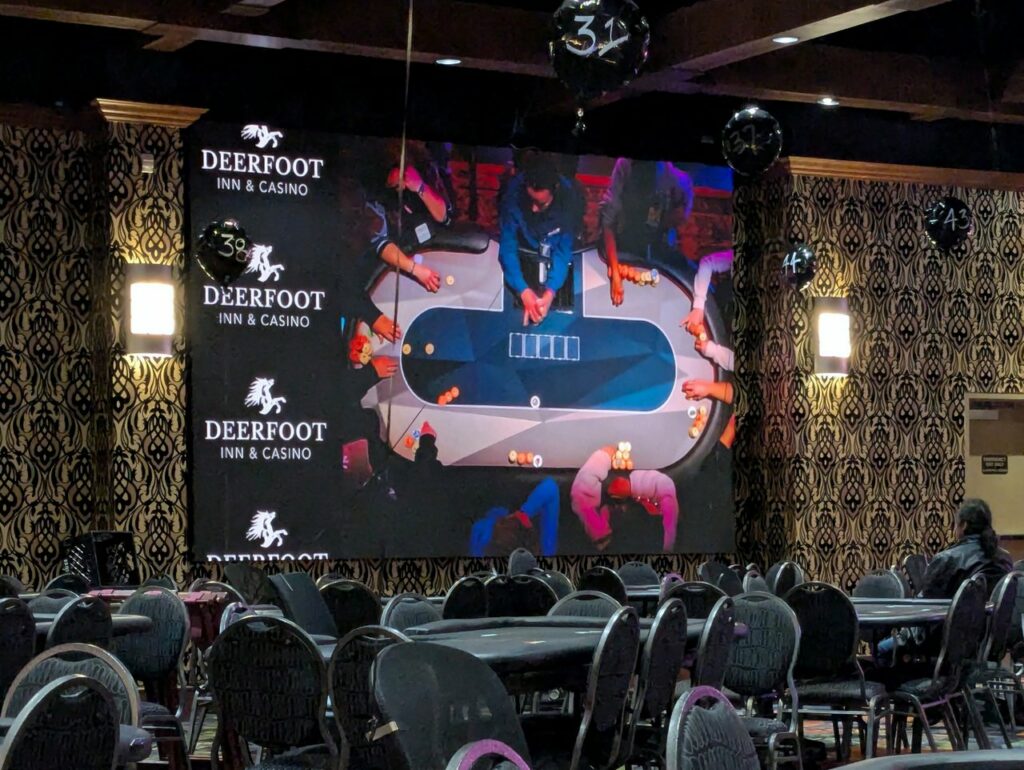The final table action from the stage is now on the big screen in Chrome. The new setup is being trialed tonight in the Ladies game as a preview to the Main Event action tomorrow.