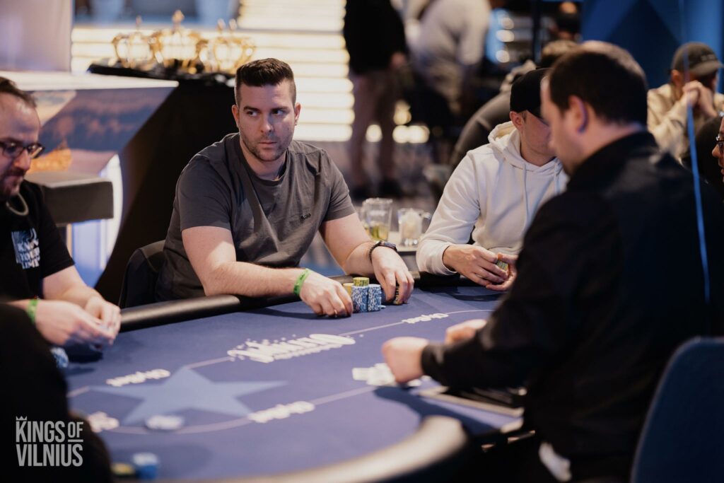 Jae Han Kim opened to 60,000 from middle position, and Deividas Butnoras called on the button. Baptiste Caim three-bet jammed for 290,000 from the small blind. Kim folded but Butnoras called.
