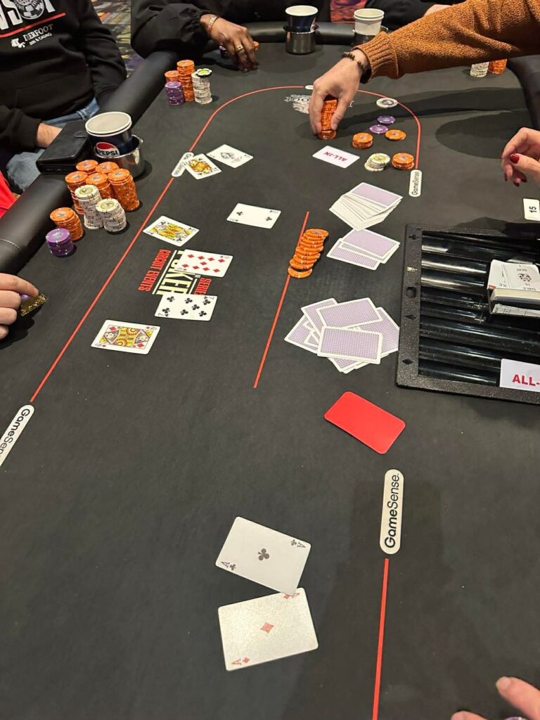The 1a field is down to 15 left, and while Maru Somers is still playing a decent stack of about 240k, she recently sent a few chips across the table to Mohsen Shafazideh in a bit of a bad beat. She was in with aces, set to send Shafazideh home and bring the game to 14 against his ace-queen. However, this is poker, and not even aces are a guaranteed win. Shafazideh found two queens on the board to take it down for a double up of his short stack.