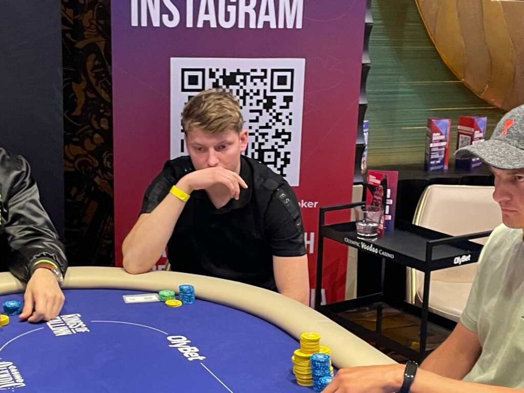 The 10♠ river paired the board, and Vaiciulionis led out with a bet of 23,000. After some thought, Zarovs jammed for 113,000.