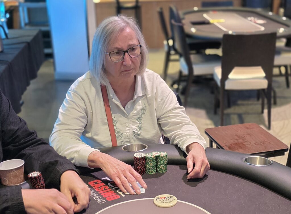 After losing the majority of her stack with ace-king against king-ten suited, Iona Bliss moved all in for her remaining 105,000. Jason Law moved all in over the top, and the remaining players folded. Both players revealed their holdings.