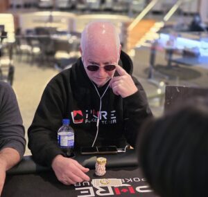 The flop and turn came the Q♦4♥J♣K♣, and Mike Malm led out for 100,000. Leon Doublet moved all in for 350,000. Malm made the fold and the three players revealed their holdings.
