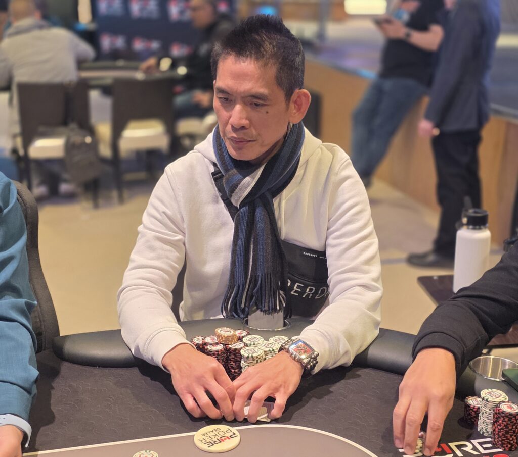 Just before the break, Julius Roque lost a big pot against Lutang Li. Li revealed Ace-Ten on the A♠5♦3♥5♣7♠ board leaving Roque with just 100,000 chips.