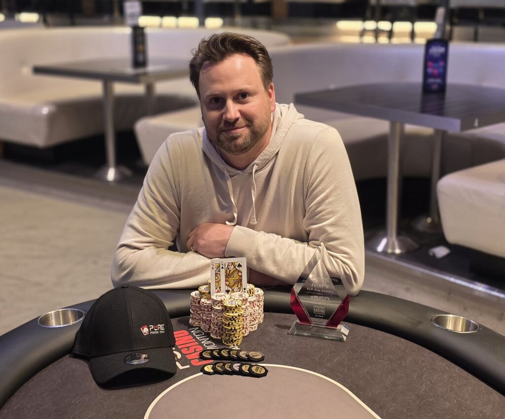 After nearly twelve hours of play, Kris Steinbach has emerged the victor of Event #6: $560 NLH Big Bounty. He bested the 123 player field in dominant fashion picking up 12 bounties along the way. The field combined for a prize pool of $58,425 ($33,825 prizes, $24,600 bounties). Rounding out the podium positions are Mike Malm and Welly Meach who each took home $5,236 for their efforts.