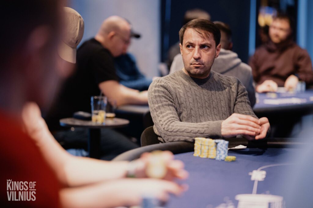 Deividas Butnoras opened to 40,000 under the gun, and received a call from Valerij Dobrinskij in the cutoff, before Roman Kulijev three-bet jammed from the big blind for 375,000.