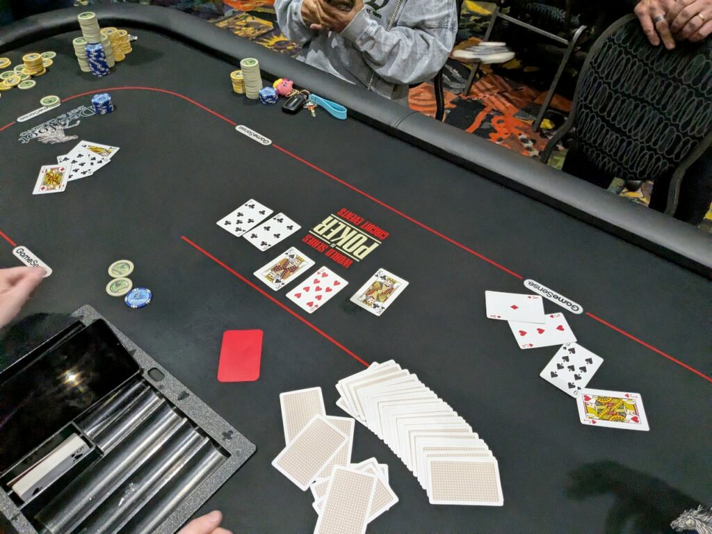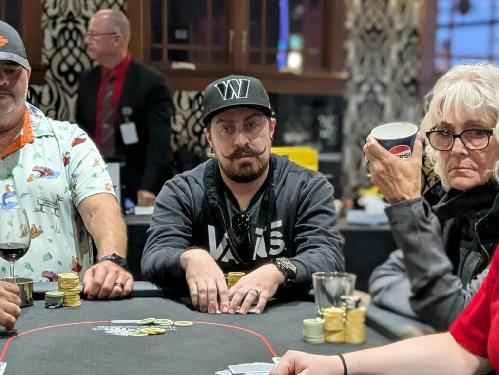 By the time they were three-handed, the stacks were very short, and Kyle Bonazzo shoved his button with [invalid notations] and Matt Hall called it off from the big stack and big blind with Q♣J♦10♠8♣.