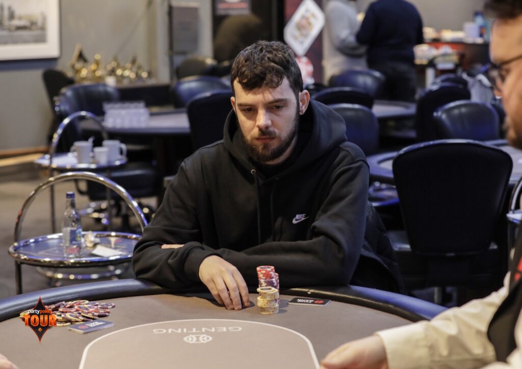 Adewale Keshinro opened to 600,000 from the hijack with A♥J♥, and Andre Leal defended the big blind with 8♣7♥.