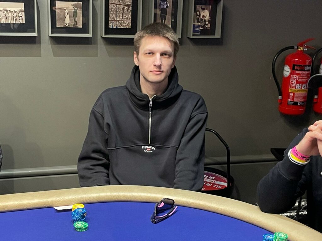 In a battle of the blinds, with 36,000 in the middle and the board reading 10♠4♠2♦6♦, Ville Keranen was all-in with the covering stack, and Mateusz Oscilowski was deep in the tank.