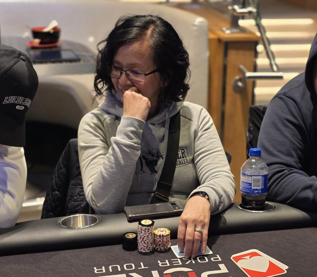 Mishel Nguyen open jammed from under the gun for 200,000, and Kris Steinbach made the call. Both players revealed their holdings.