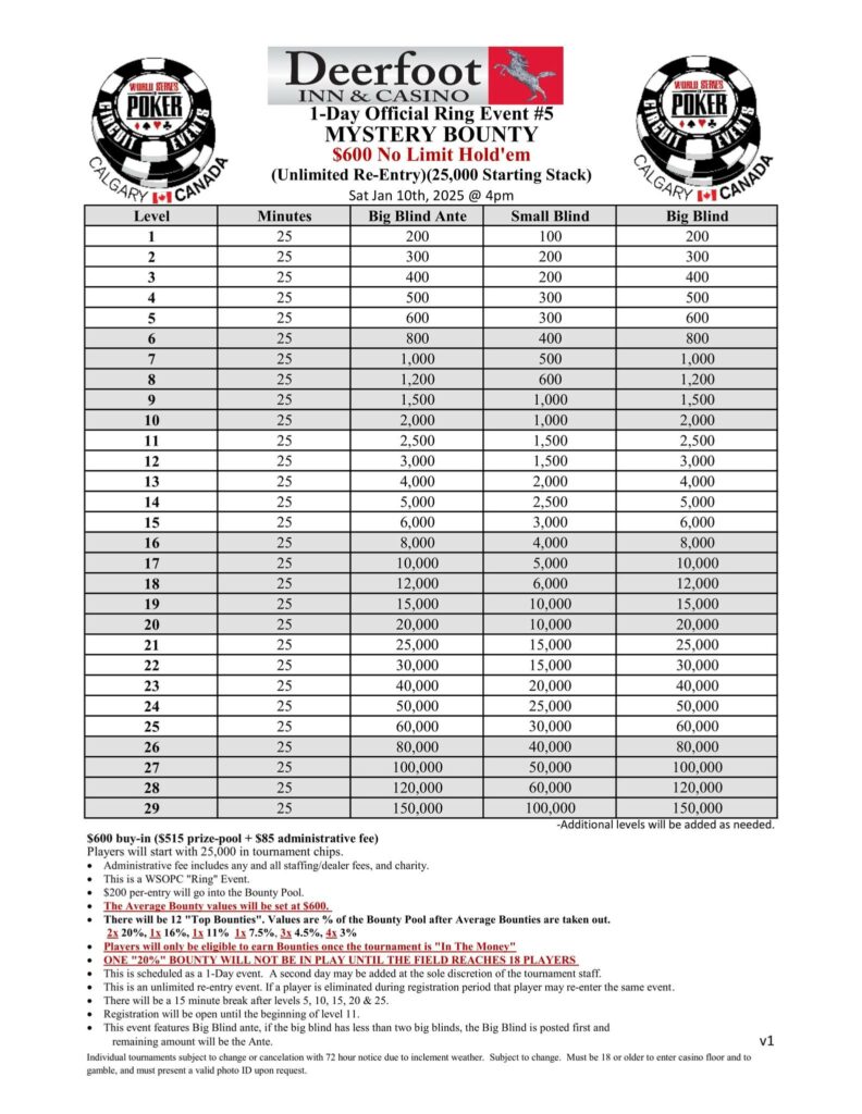 The side game on Saturday is the Mystery Bounty. The game starts at 4 PM with players sitting down with 25k in chips. Blinds are 25 minutes long.