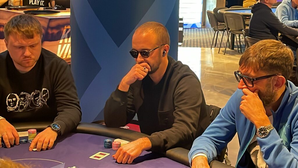 With 6,500 in the middle on a flop of J♣9♣4♥, Gatis Popovs, High Roller champ Tomas Bulksas and Aigars Petrovs checked to see the 6♦ turn.
