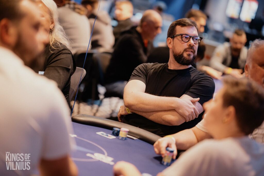 Action folded all the way to Evaldas Narmontas in the Small Blind, who forced Justas Semaška (Big Blind) all in for roughly 50,000. Semaška peeked at his holdings and then called without hesitation.