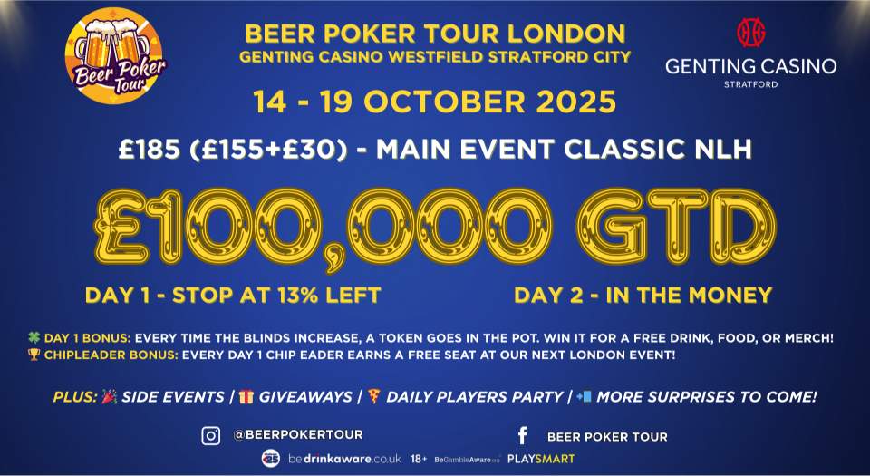 The next Beer Poker Tour event will be held October 14-19. As with the previous three events, Genting Casino Stratford, London, will once again roll out the red carpet. As previously stated, the Beer Poker Tour is growing, and the spurt is only continuing. The upcoming edition has a record-breaking £125,000 guarantee across the whole festival. £100,000 of the guarantee is dedicated to the star of the show, the £185 Main Event. With a whopping seven starting-day flights, the turnout is expected to be on the larger side. During the last edition back in September, the same £100,000 guarantee was surpassed, and the final prize pool read £109,755. Speaking of the most recent event, it was quite the rollercoaster finish, as the final five players all made a deal.