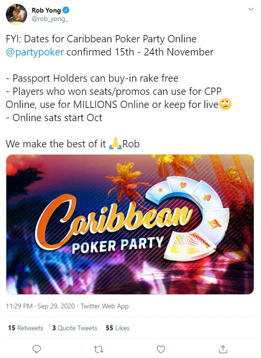As Rob Yong wrote on his Twitter, the Caribbean Poker Party will take place on the partypoker Network (partypoker, Coral Poker) from November 15th to November 25th. There will be 10 events on the schedule, which you will be able to attend via different satellites, which will start from $0,01 onwards. Online satellites start in October.