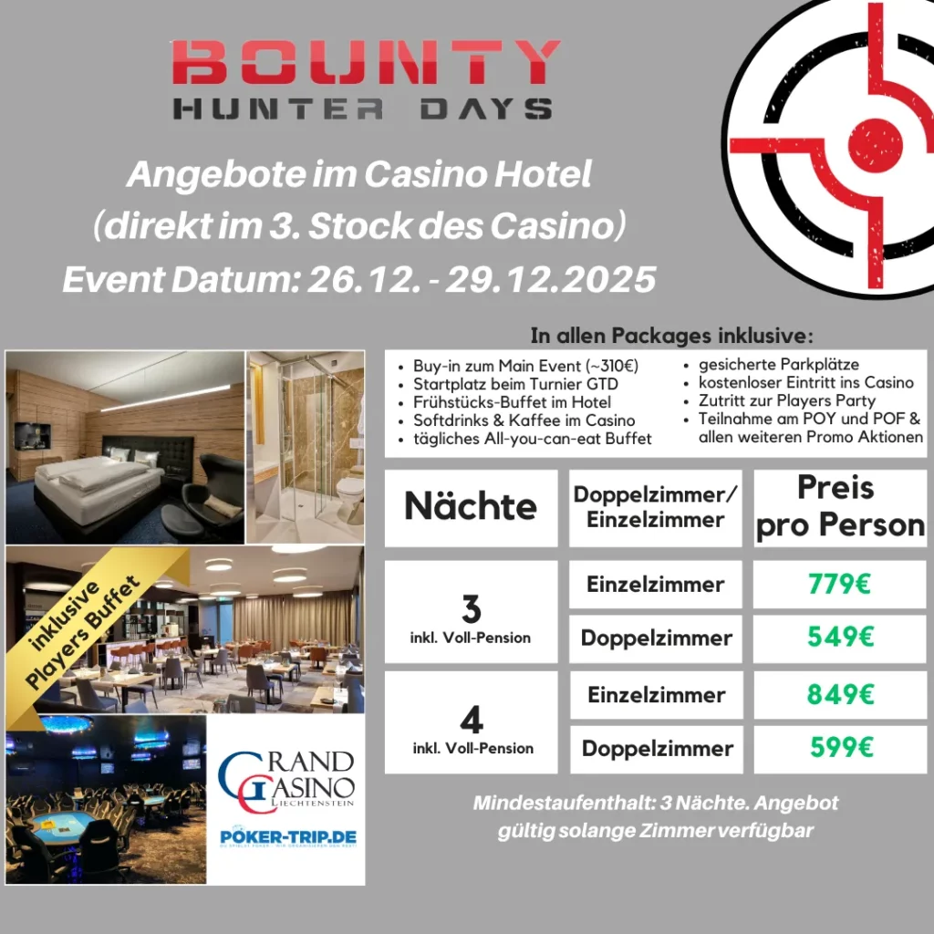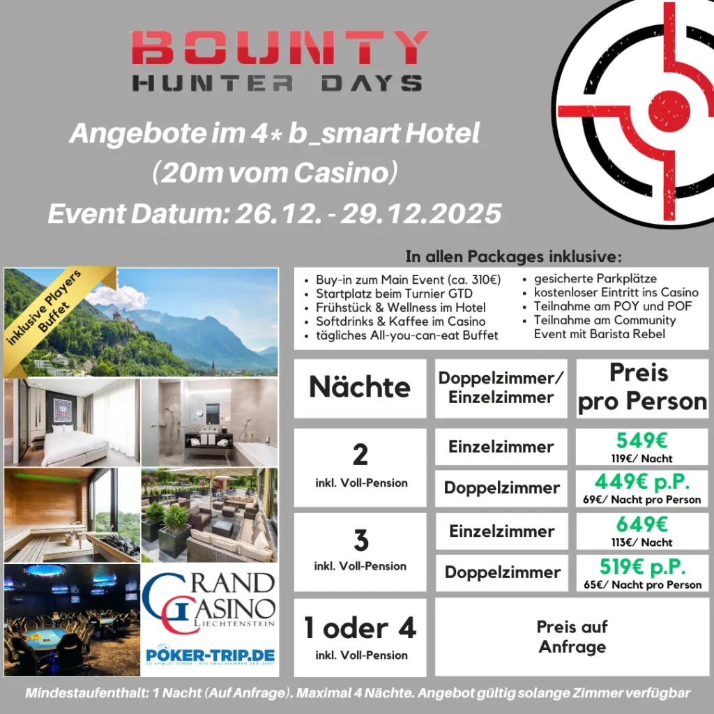 Bounty Hunter Days at the Winter Festival in Liechtenstein kicks off on the day after Christmas. Work off your post-holiday doldrums at the poker tables with one of the most unique MTT series offerings of the season.