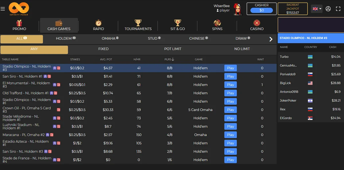 There are Cash Games on low, up to mid-stakes, which quickly started filling with players. Infinity Poker of course is aiming to offer games up to the highest stakes possible.