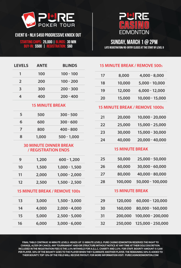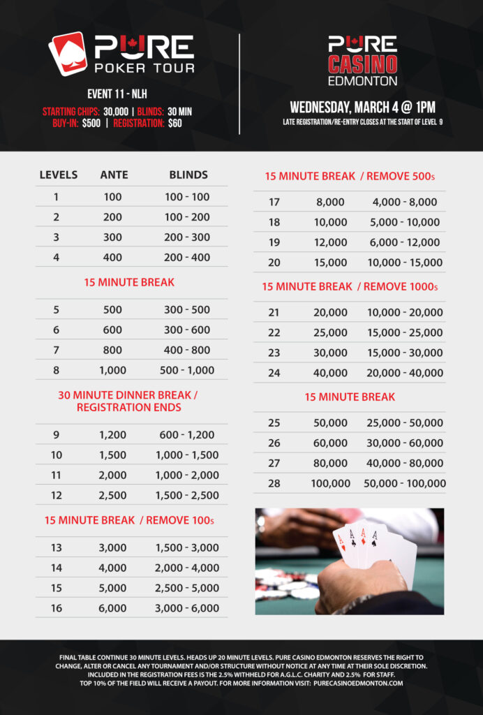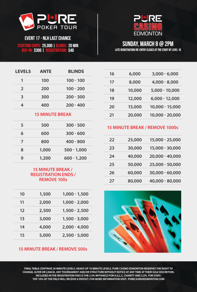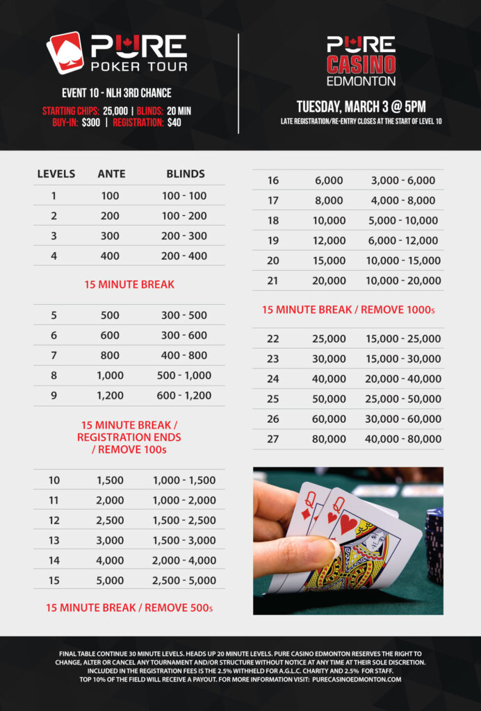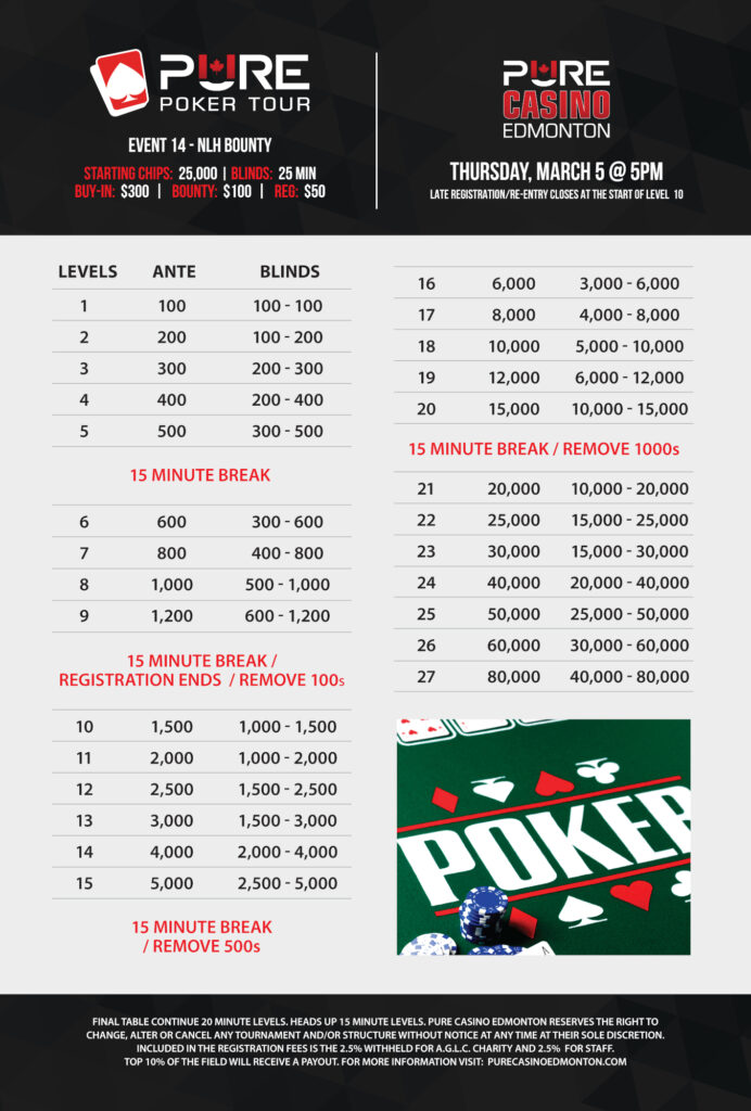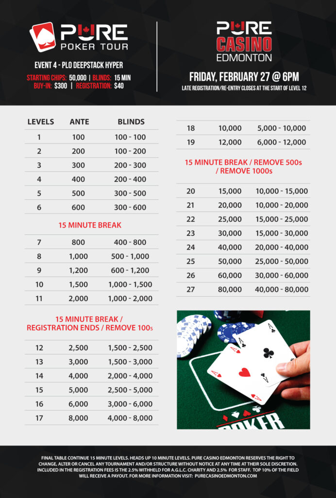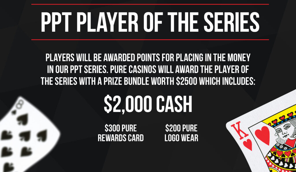 Points earned during PPT series also count towards the larger Player of the Year race. That race has $10k in value up top, and includes points earned in all five PPT series, as well as monthly Deepstack games at the various Pure properties around Alberta.