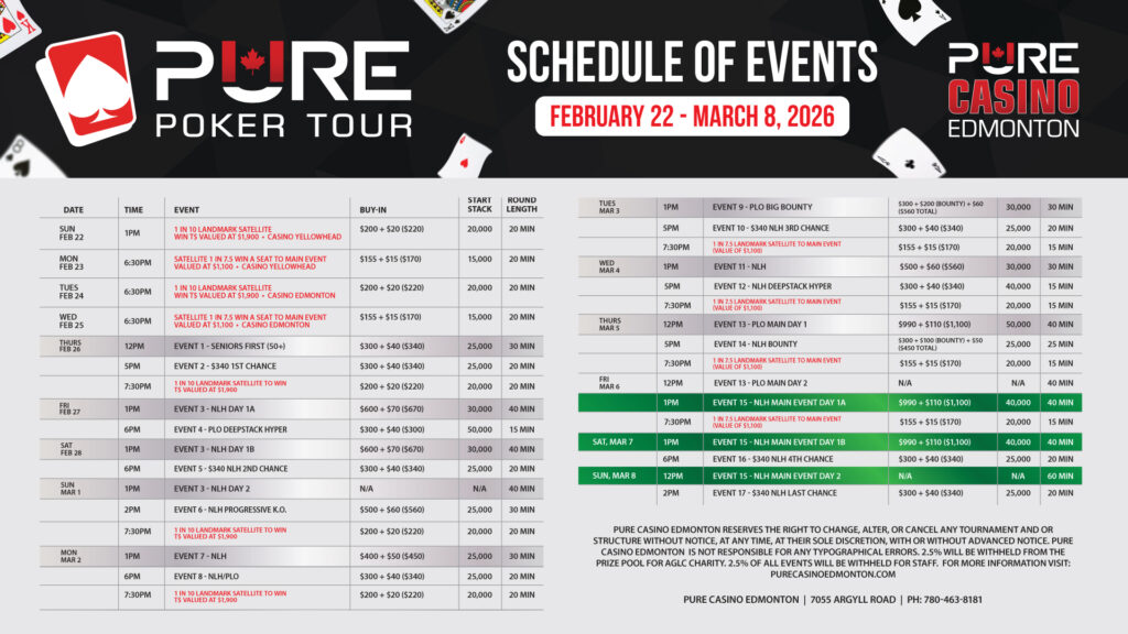 The 2026 Pure Poker Tour (PPT) season is nearly underway, with the opening series set to run at Pure Casino Edmonton from Feb 22 – Mar 8. As usual, the series action kicks off with a week of satellite play alternating between the Argyle facility and Pure Casino Yellowhead.
